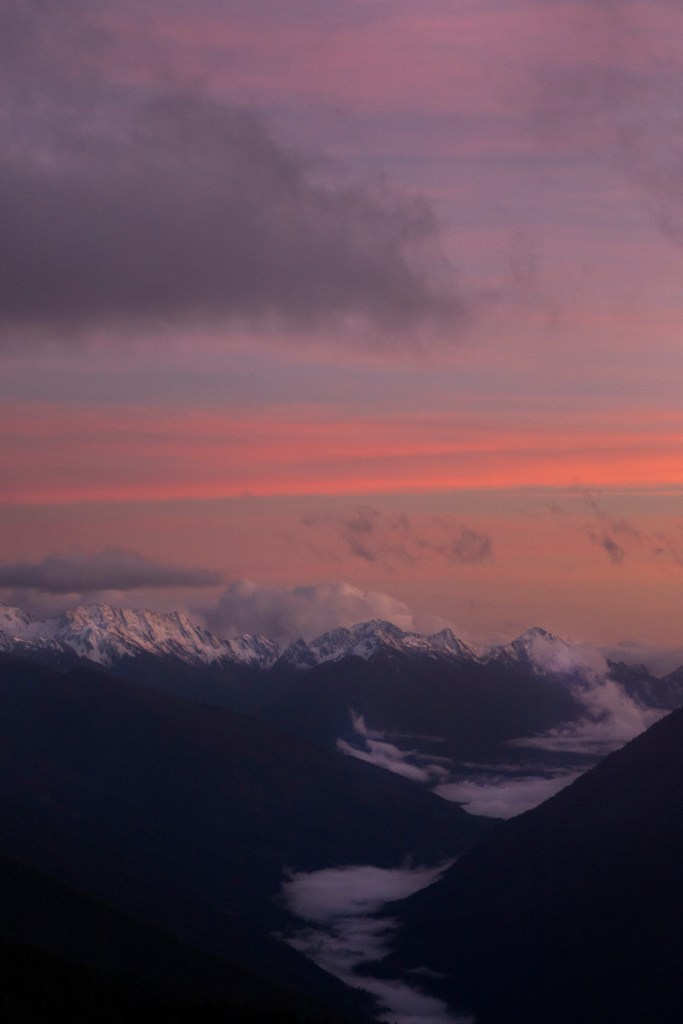 The sun was shining high in the sky when I got back to Sequim. I laid outside until my friends were ready to head back into the park. When we got to the park all the snow had melted. We parked at the Hurricane hike and walked along the mountains in the brisk air. The higher we got the stronger the wind blew. We walked until we were consumed by a cloud and could no longer see anything around us. As we walked back the sky turned into pink and purple as the clouds hugged the mountains.