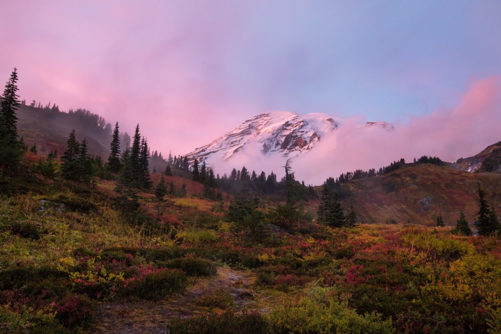 The clouds were disappearing as we arrived at the park and Mount Rainier loomed over us as we drove higher towards Paradise. We arrived at the same parking lot we had come to earlier this week, but this time there was no snow and we could see mountains in the distance. We made our way down the trail—amazed by the majestic view we could not see a week ago. The fields were sprinkled with red and yellow leaves among deep green pines trees stretching up towards the snow-covered Mount Rainier resting among drooping hills. As we arrived to the waterfall the sky turned a soft blue while sounds of rushing water ran around us. We were enjoying the serene view as a large, pink cloud swept across the mountain reflecting pink light along the horizon while all the foliage erupted in color. It’s always the moments right after the sun sets that shine the brightest.
